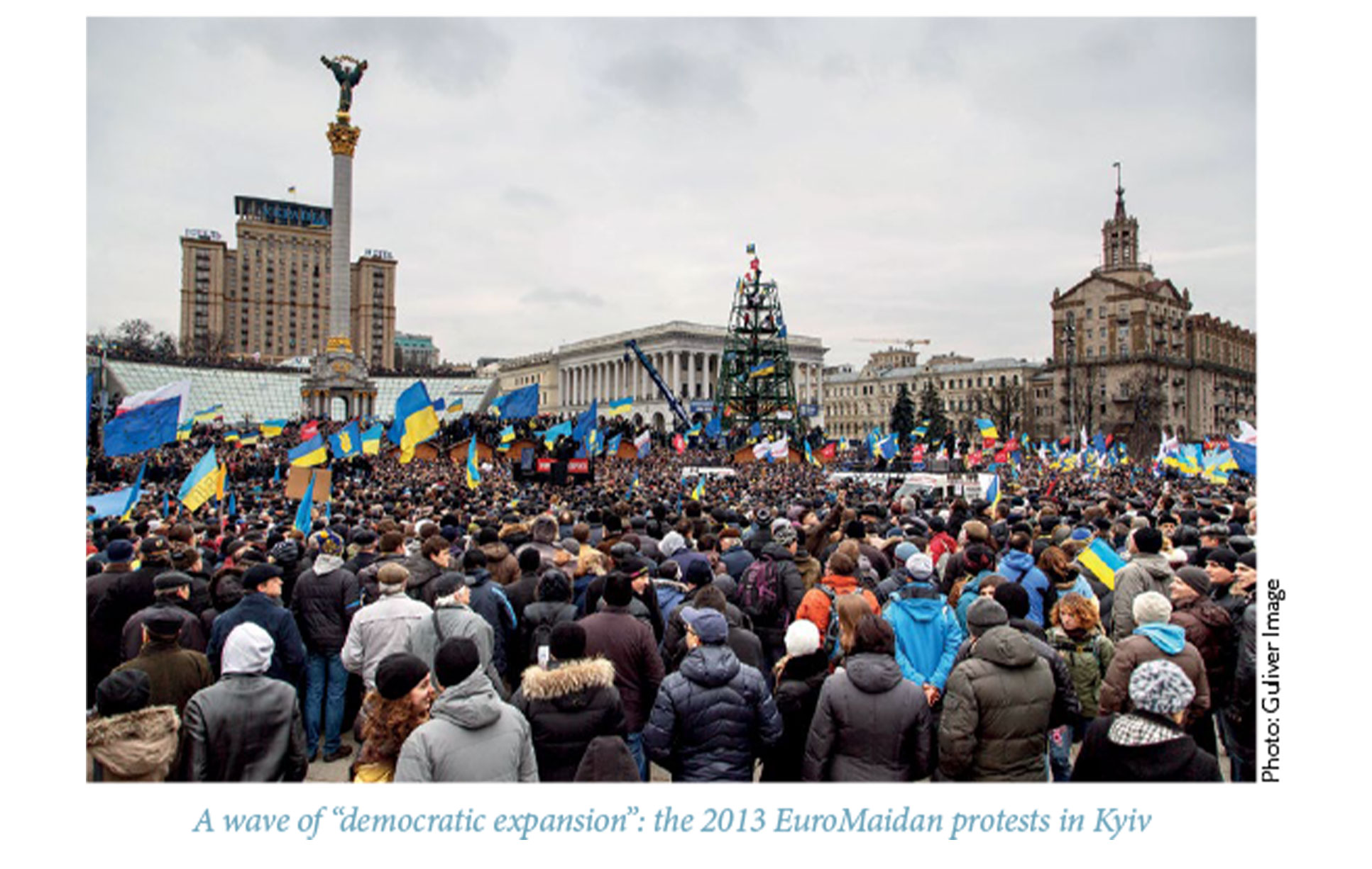 To the surprise of everyone in Moscow, Kyiv, Brussels, and Washington, Yanukovych’s decision to scuttle this agreement with the EU triggered mass demonstrations in Ukraine again, with hundreds of thousands of Ukrainians pouring into the streets in what would become known as the EuroMaidan or “Revolution of Dignity” to protest Yanukovych’s turn away from the democratic West. The street protests lasted several weeks, punctuated tragically by the killing of dozens of peaceful protestors by Yanukovych’s government, the eventual collapse of that government and Yanukovych’s flight to Russia in February 2014, and a new pro-Western government taking power in Kyiv. Putin had “lost” Ukraine for the second time in a decade, again because of democratic regime change.