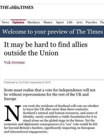 Next week the residents of Scotland will vote on whether to leave the UK after more than three centuries. Scotland’s natural and human resources, and sense of identity, surely constitute a viable foundation for it to stand alone on the global stage in the future. Yet the economic and diplomatic consequences of a “yes” vote would be felt far beyond Britain’s borders, significantly impacting on European and international engagements.