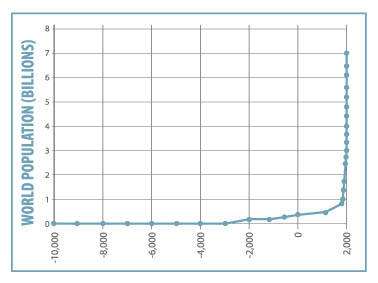 For the long stretch of human history the global population remained virtually unchanged. The change over centuries was so small that it was nearly imperceptible to those who lived at any time in the preindustrial age (except of course for rare episodes such as the Black Death in Europe). Yet after 1800 or so, the world’s population began to soar. This is mainly (though not only) because the advances in global technology included the ability to grow vastly more foodstuffs to feed a growing world population. The result is that the global population has risen roughly eight-fold since 1800, from around 900 million to 7.2 billion people today.
